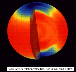 圖七、最近科學家對太陽表面以及內部氣體差動自轉的觀測結果。圖中顏色由紅到藍表示旋轉速度由快到慢。