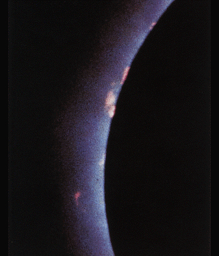 圖四、日蝕的時候,在太陽周圍的淡藍色「日冕」以及淺紅色的「日珥」,是肉眼可見的太陽表面之電漿物理現象
